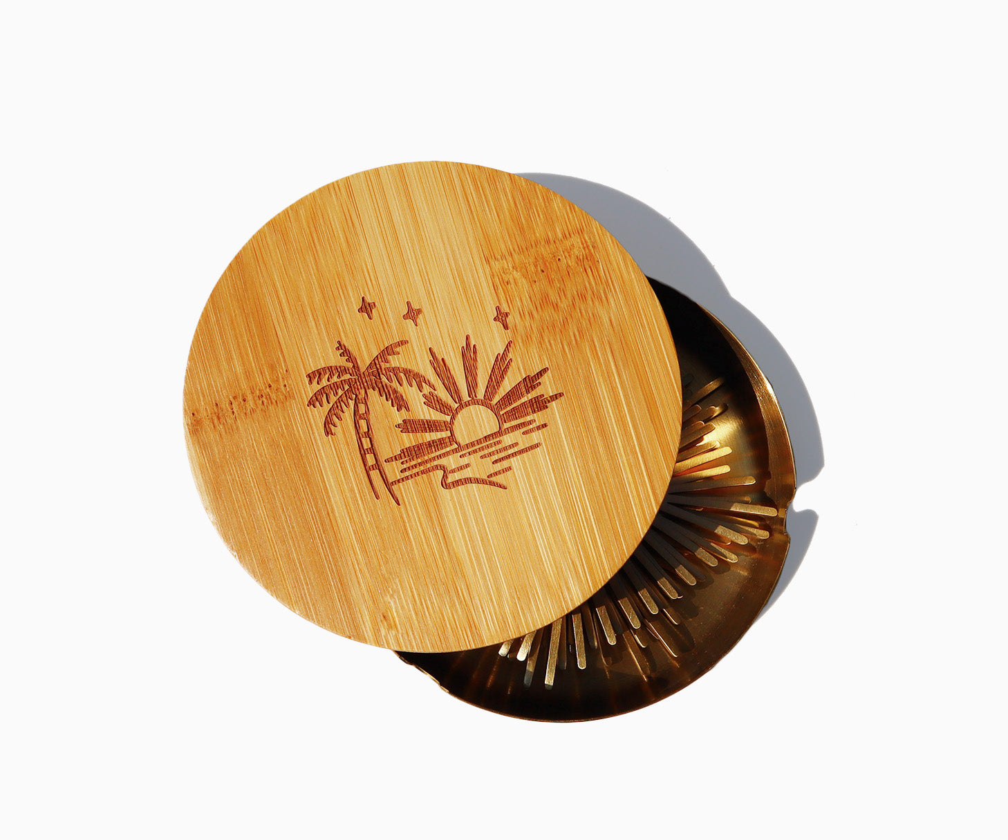Nestled in a gleaming brass ash tray, this set comes with a wooden lid that’s engraved with a breathtaking island scene—palm trees swaying, stars shining, and an ambiance that’ll transport you straight to paradise.