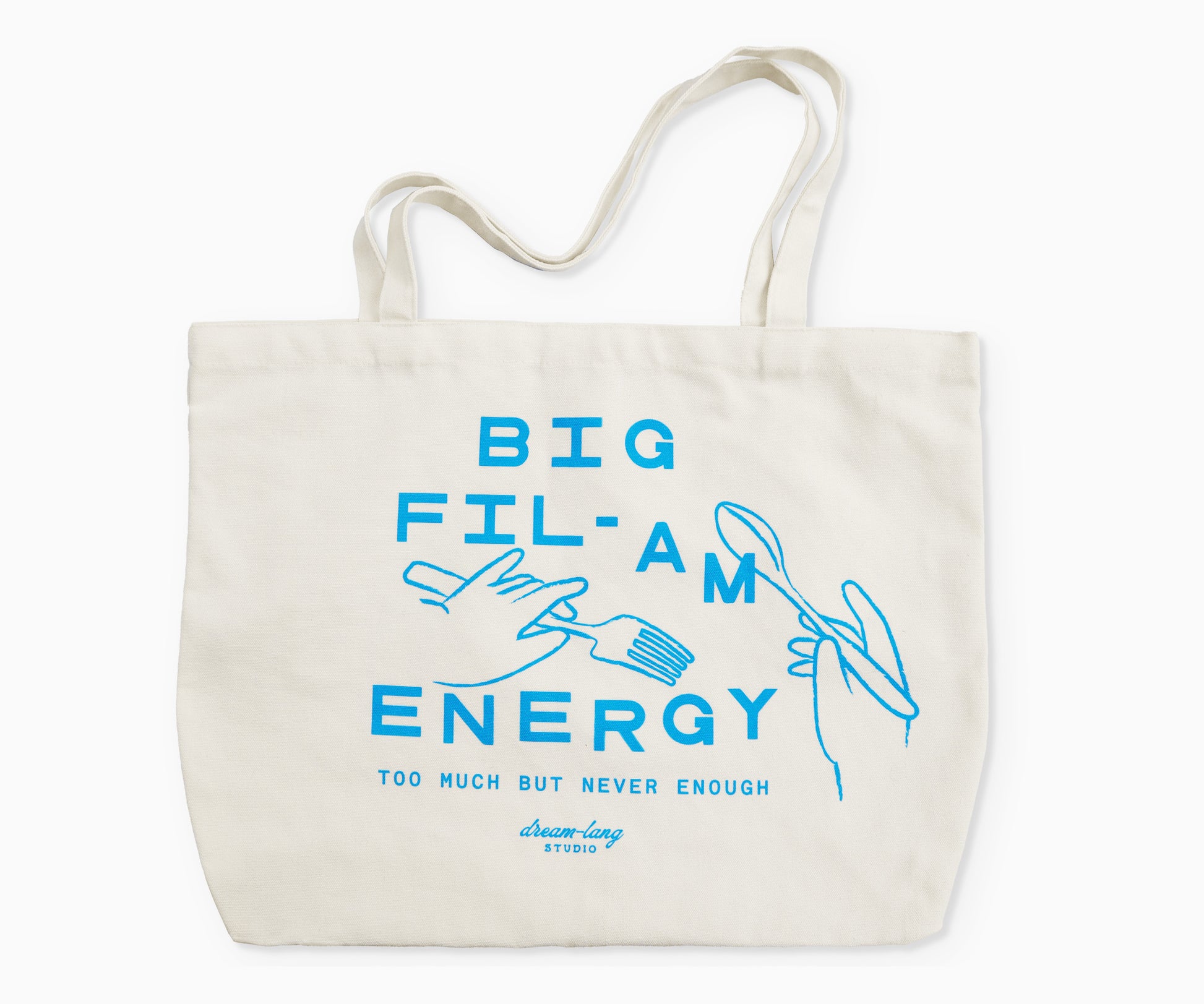 In bold lettering, it reads 'Big Fil-Am Energy', with the phrase 'too much but never enough' reminds us that when cultures collide, it's hard to find where you belong – but that's what makes it beautiful.