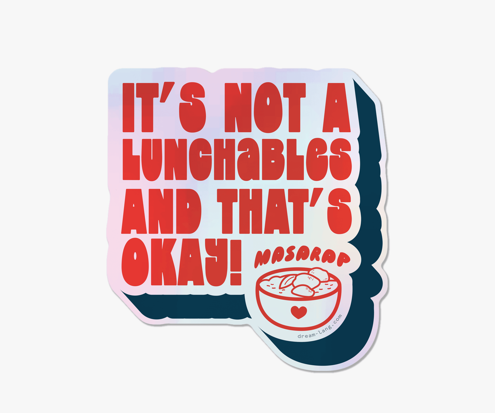 Celebrate the uniqueness of your lunch with our "It's Not a Lunchables, and That's Okay!" Holographic Sticker. Perfect for kids who bring baon to school and want to embrace their special meals, this sticker features the reassuring phrase in a playful design. Made from high-quality, durable material, the holographic finish catches the light, creating a dazzling rainbow effect. Ideal for decorating lunchboxes, water bottles, notebooks, and more, this sticker is a stylish and affirming way to show that homemade lunches are just as cool. Pictured with a little bowl of adobo with the words "masarap". Stand out and be proud of your baon with this vibrant and empowering holographic sticker!